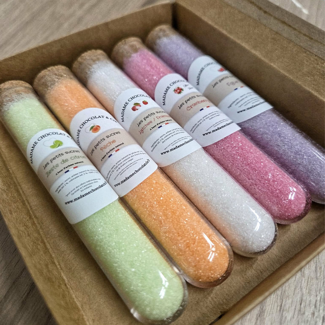 Coffret de  5 fioles de sucres aromatisés « Les fruités », livrés dans une boite en kraft. Fabrication française et artisanale.