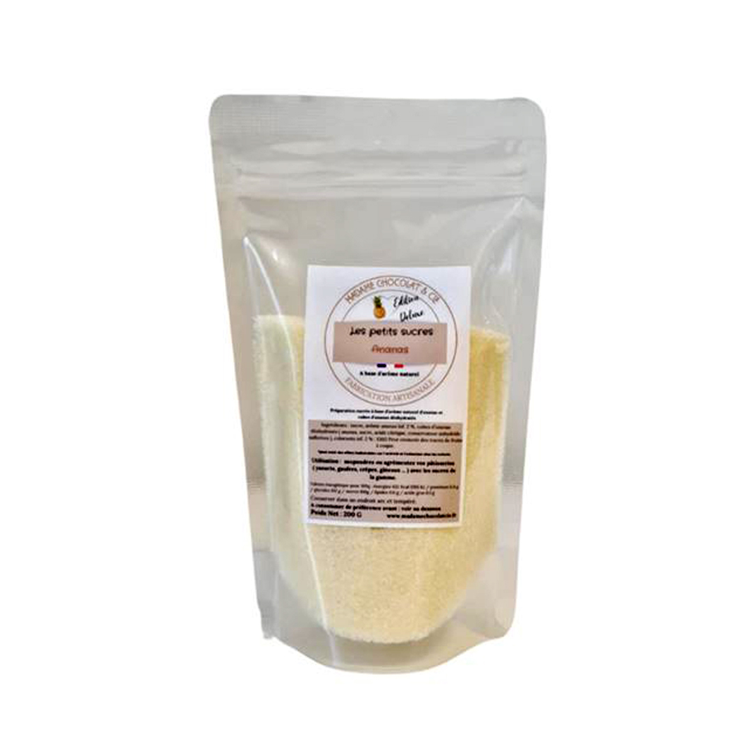 Ingrédients : Sucre, arôme ananas inf. 2 %, cubes d’ananas déshydratés (ananas, sucre, acide citrique, conservateur anhydride sulfureux), colorants inf. 2 % : E102.