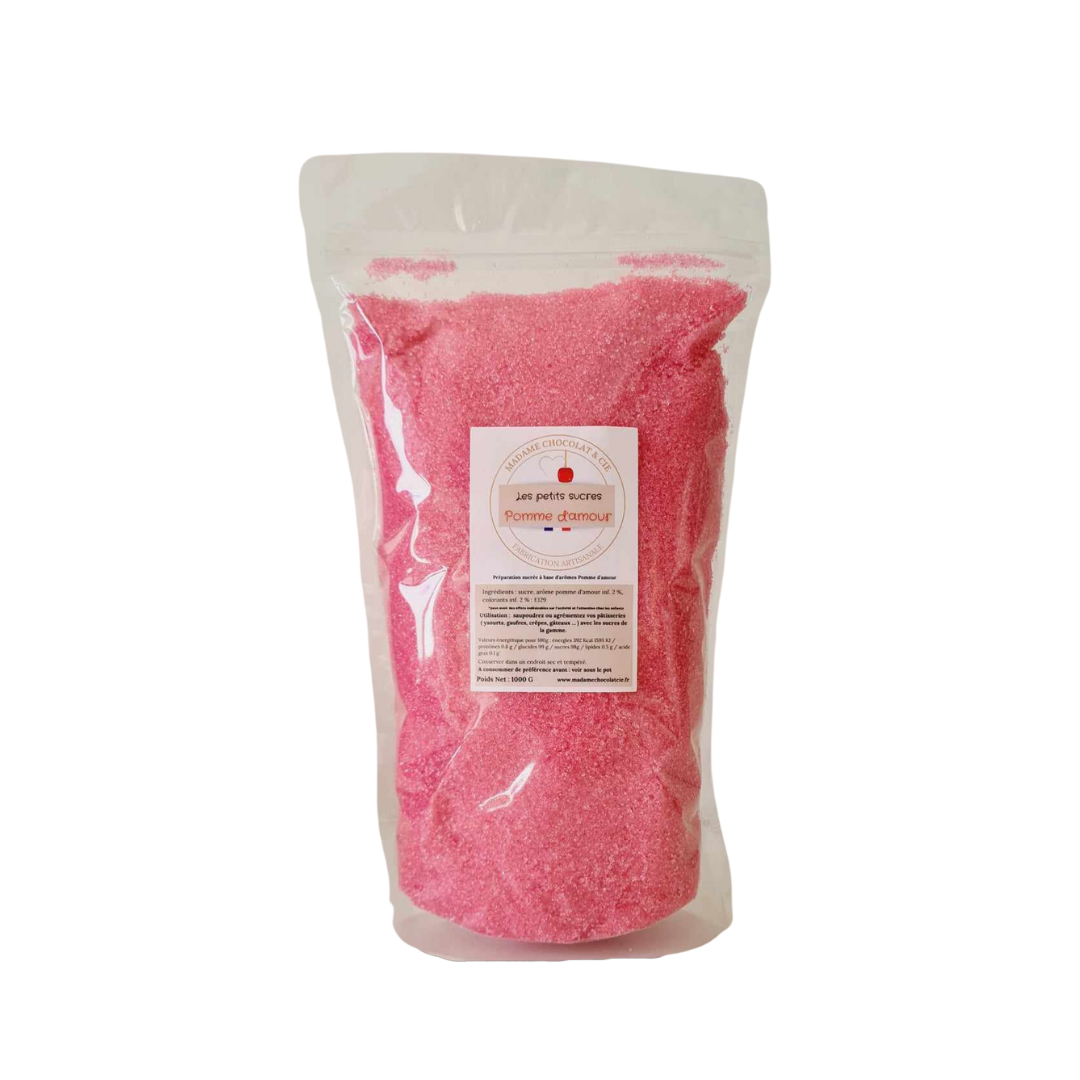 Ingrédients : Sucre, arôme naturel pomme d’amour inf. 2 %, colorants inf. 2 % : E120 E330, conservateur E202.